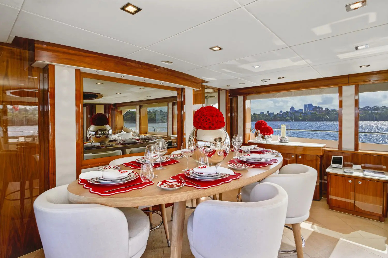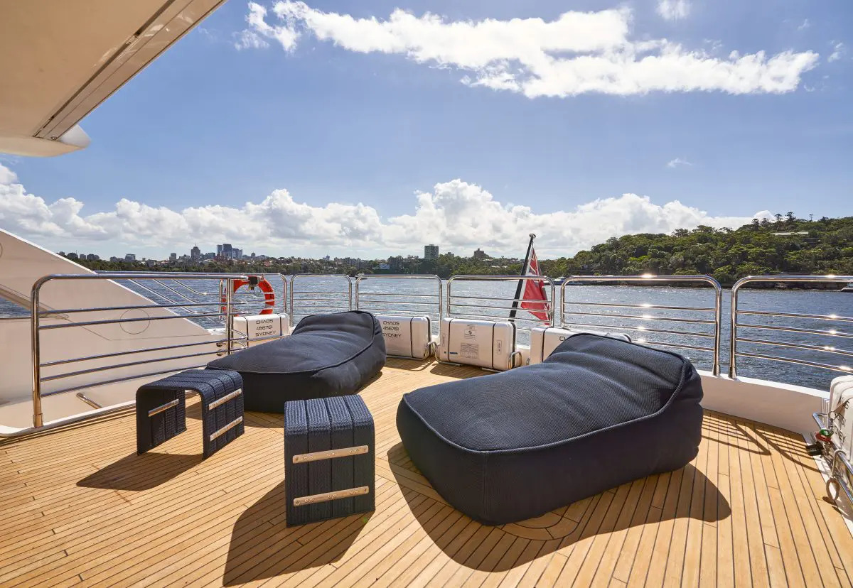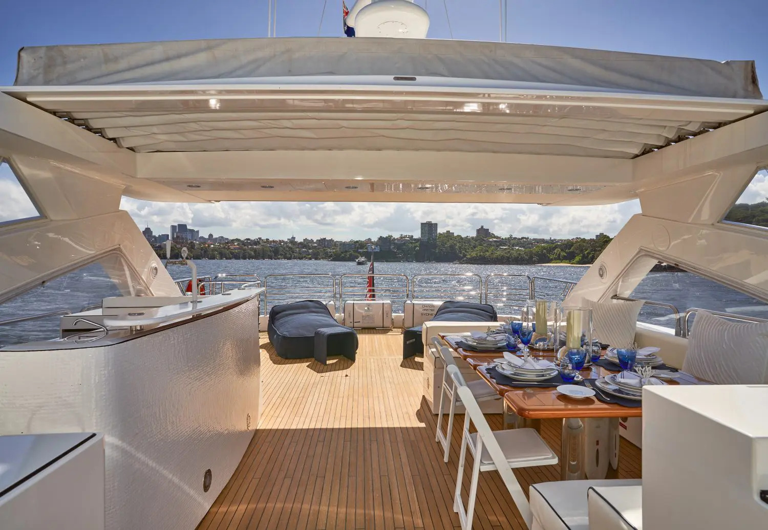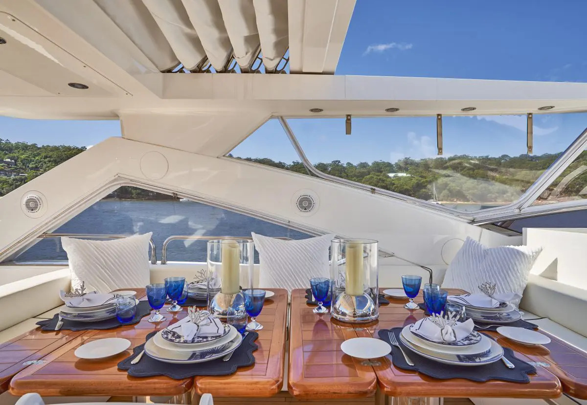 Privacy has a large open-plan design and a full-length retractable solar roof. The main deck integrates the dining, lounge and aft deck into an ideal space for entertaining and is an ideal choice for your luxury functions. It is perfect for small and medium-sized groups and for tour trips.